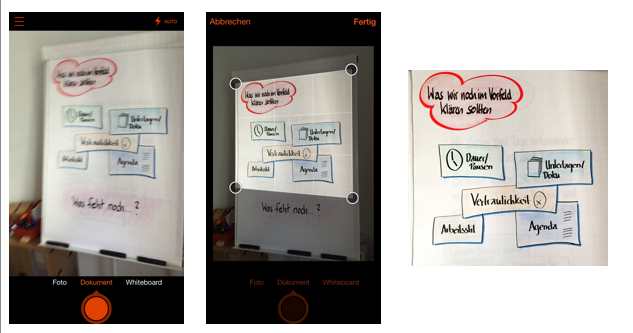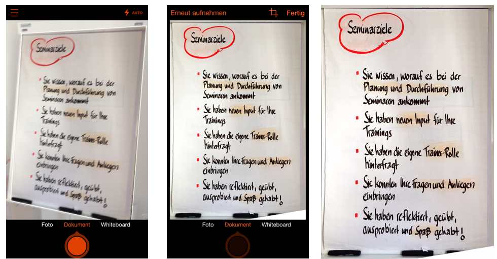Im angesprochenen Artikel „Fotoprotokolle schneller machen“ haben ich gezeigt, wie man über die Fotoalbum-Funktion von Powerpoint mit wenigen Schritten ein erzeugen kann. Voraussetzung ist dabei, dass das Bildmaterial bereits vorliegt und man keinen weiteren Zuschnitt der Aufnahmen mehr benötigt. Gerade wenn man Flipcharts schnell abfotografiert passiert es aber, dass die Aufnahme schräg und / oder unscharf ist.