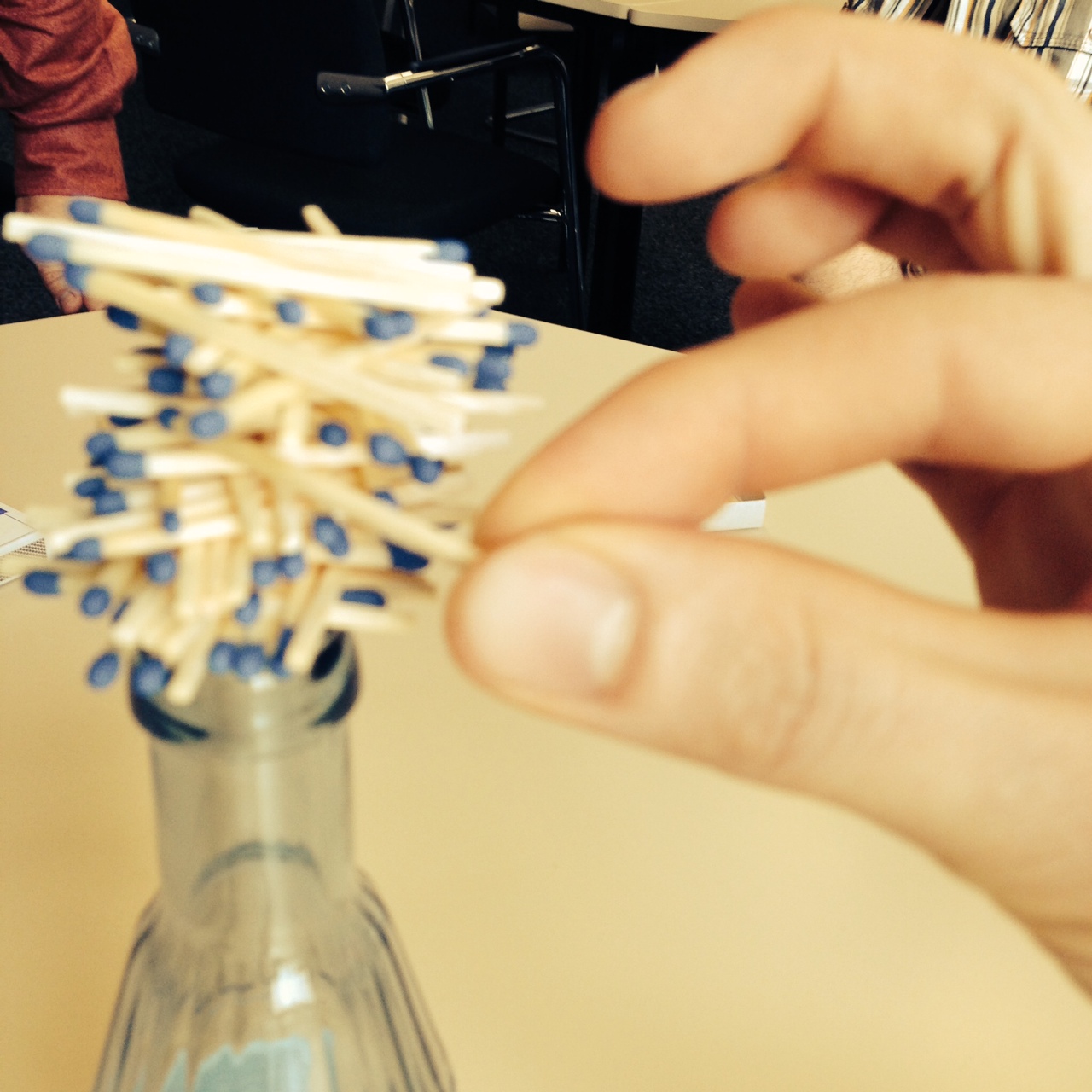 - Reihum werden Streichhölzer einzeln auf dem Flaschenhals abgelegt
