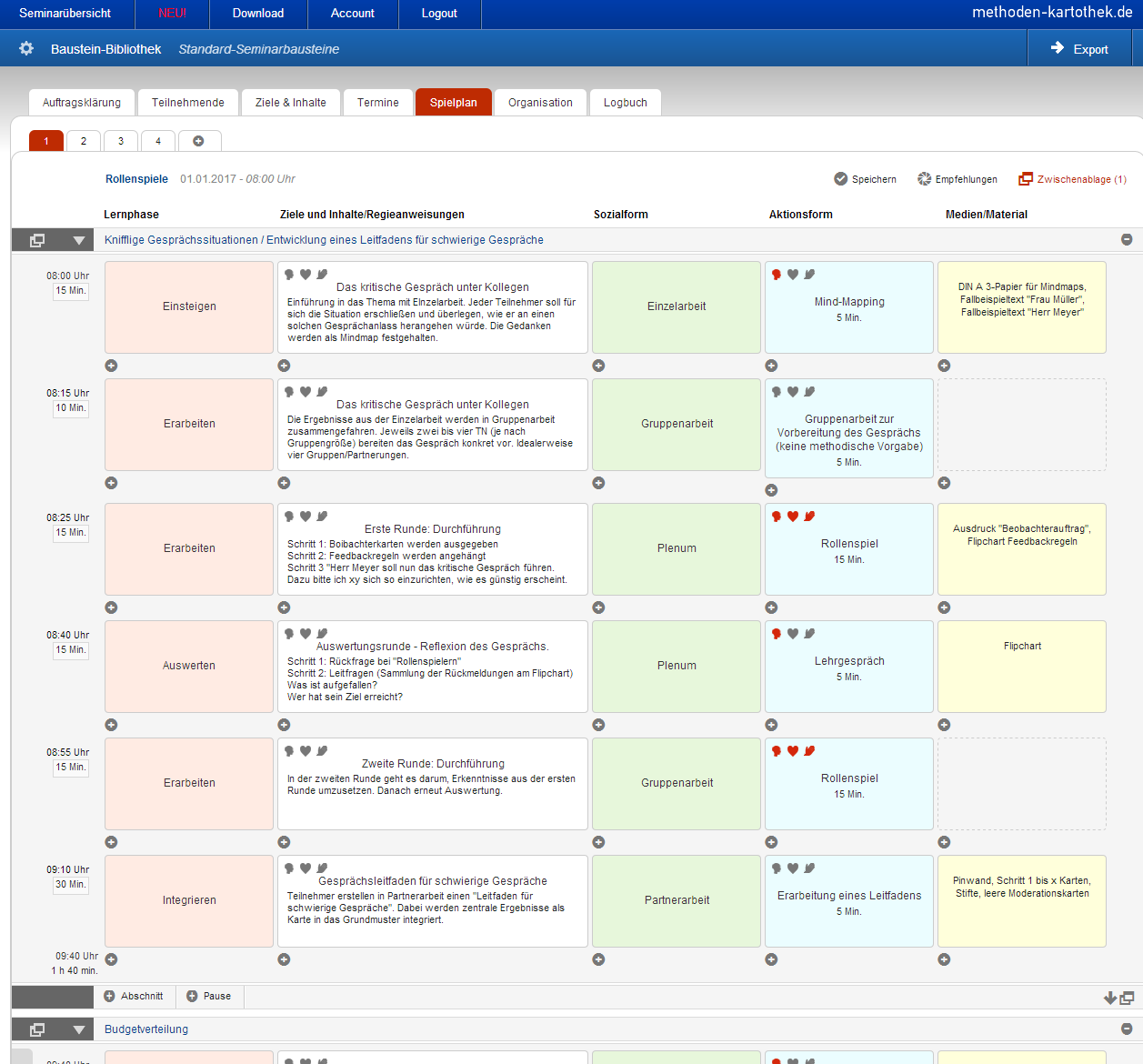 Wie man in der Planung aus methoden-kartothek.de sieht, ist der Seminarablauf inhaltlich neutral gestaltet – die Variation entsteht durch die unterschiedlichen Rollenbeschreibungen. Diesen Ablauf habe ich in meiner Bausteinbibliothek abgelegt – jetzt füge ich in neue Planungen ein und wandle ihn dort bei Bedarf ab (die Bausteinbibliothek hat Ulrich Müller hier beschrieben). Dieses Verfahren spart mir viel Zeit und ich erzeuge auf diese Art und Weise schnell und einfach Ablaufpläne, die ich bei der Durchsprache mit den Auftraggebern vorlegen oder an Trainerkollegen weitergeben kann. Eine feine Sache!