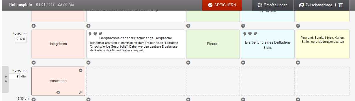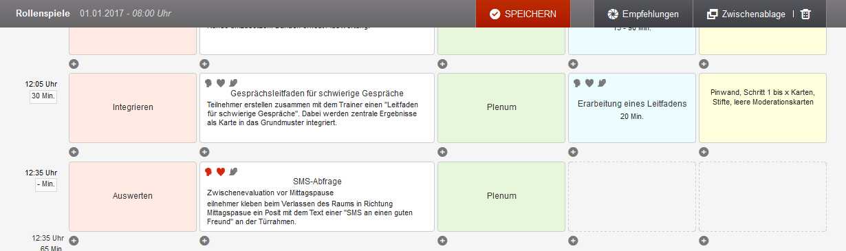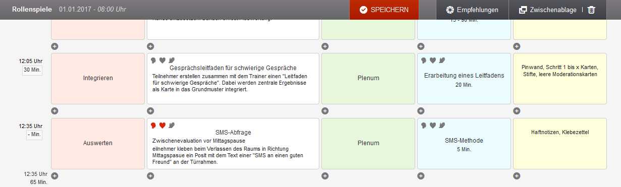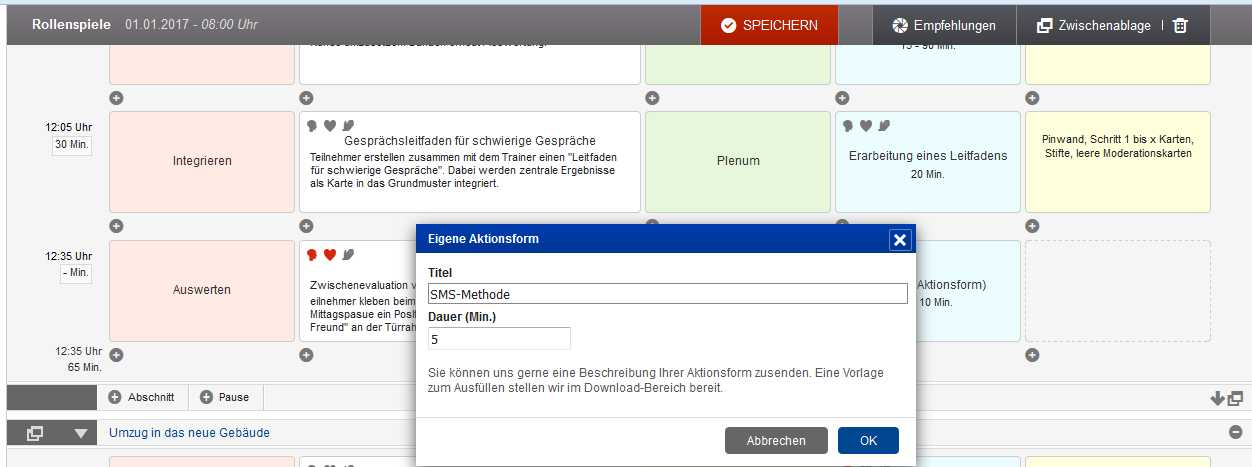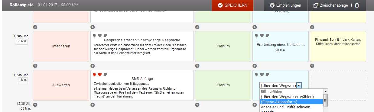 Ein Beispiel: Die von mir häufig und gern verwendete „SMS-Methode“ für ein Zwischenfeedback findet sich nicht in methoden-kartothek.de. Über die Auswahl „Eigene Aktionsform“ lässt sich diese aber trotzdem im Ablaufplan verwenden.