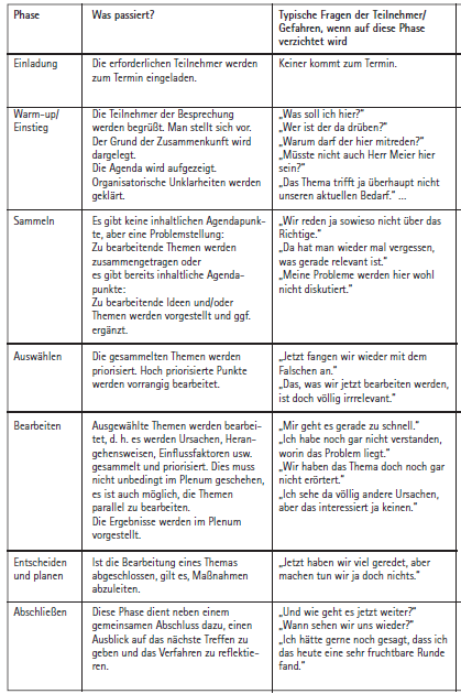 In dieser Tabelle habe ich den Phasenverlauf der Moderation dargestellt. Zusätzlich ergänzt habe ich typische Fragestellungen und Gefahren, zu denen es kommt, wenn man einzelne Phasen auszulassen versucht.