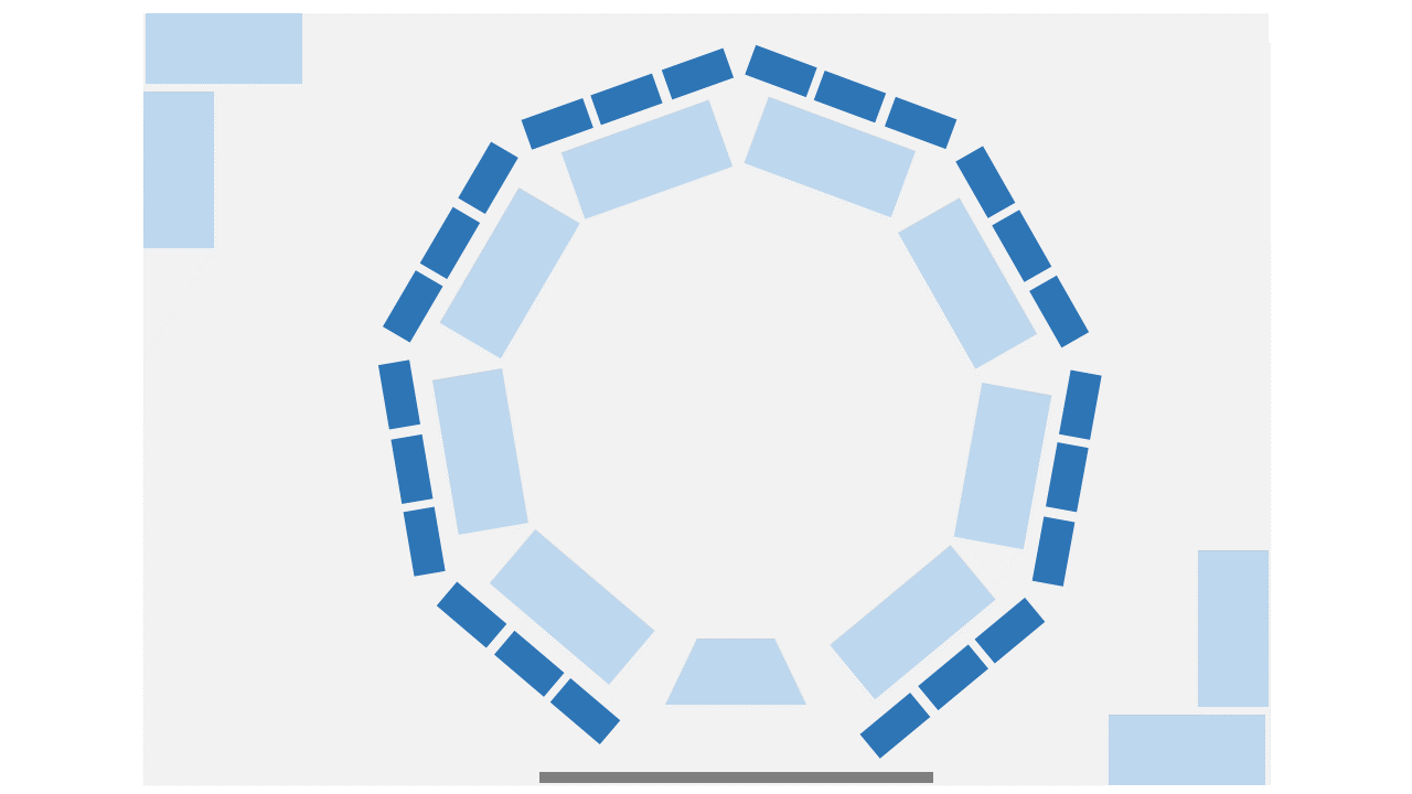 - Dialogbereite Blickrichtung: Alle Akteure im Raum sollen sich jederzeit anblicken und ansprechen können. Beim Erfahrungsaustausch, kreativen Arbeiten oder in kontroversen Diskussionen steht nicht der Dozent, sondern die Seminarteilnehmer im Mittelpunkt.