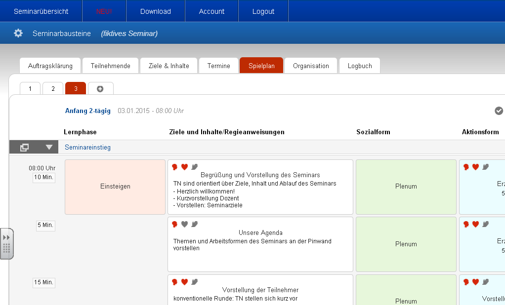 Wenn ich ein neues Seminar plane, sehe ich erst einmal in meiner „Baustein-Bibliothek“ nach, ob ein passender Einstieg dabei ist. Den hole ich mir dann in meine neue Planung rein. Mit den Funktionen „Abschnitt kopieren“ – „Abschnitt einfügen“ geht das sehr komfortabel mit einigen wenigen Mausklicks. Ich wandle die gewählte „Standard-Eröffnung“ dann entsprechend dem neuen Thema, der neuen Zielgruppe ab.