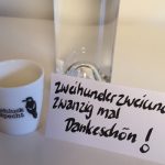 Seit gestern stehen wir in der begehrten Währung unserer Zeit, den “likes” auf Facebook, bei der Zahl 222. Eine Schnapszahl! Wir stoßen an und unser zweihundertzweiundzwanzigster Follower (wenn man das auf Facebook auch so nennt) bekommt von uns eine schokoladige Überraschung mit der Post!